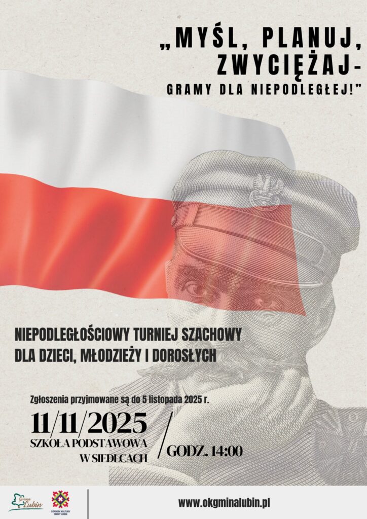 Z okazji Narodowego Święta Niepodległości zapraszamy wszystkich miłośników królewskiej gry na Niepodległościowy Turniej Szachowy dla dzieci, młodzieży i dorosłych, który odbędzie się 11 listopada 2025 roku o godz. 14:00 w Szkole Podstawowej w Siedlcach.
