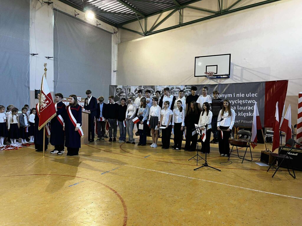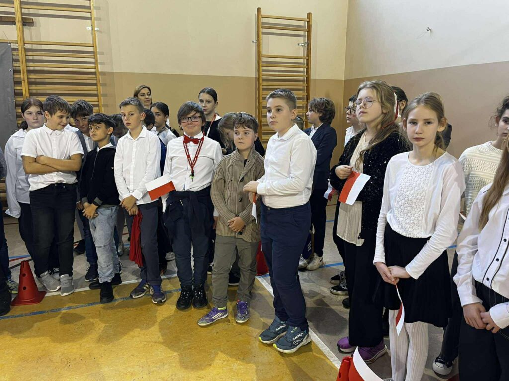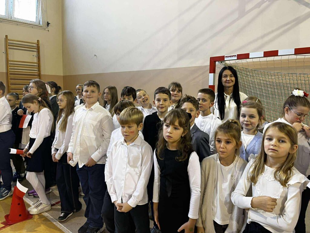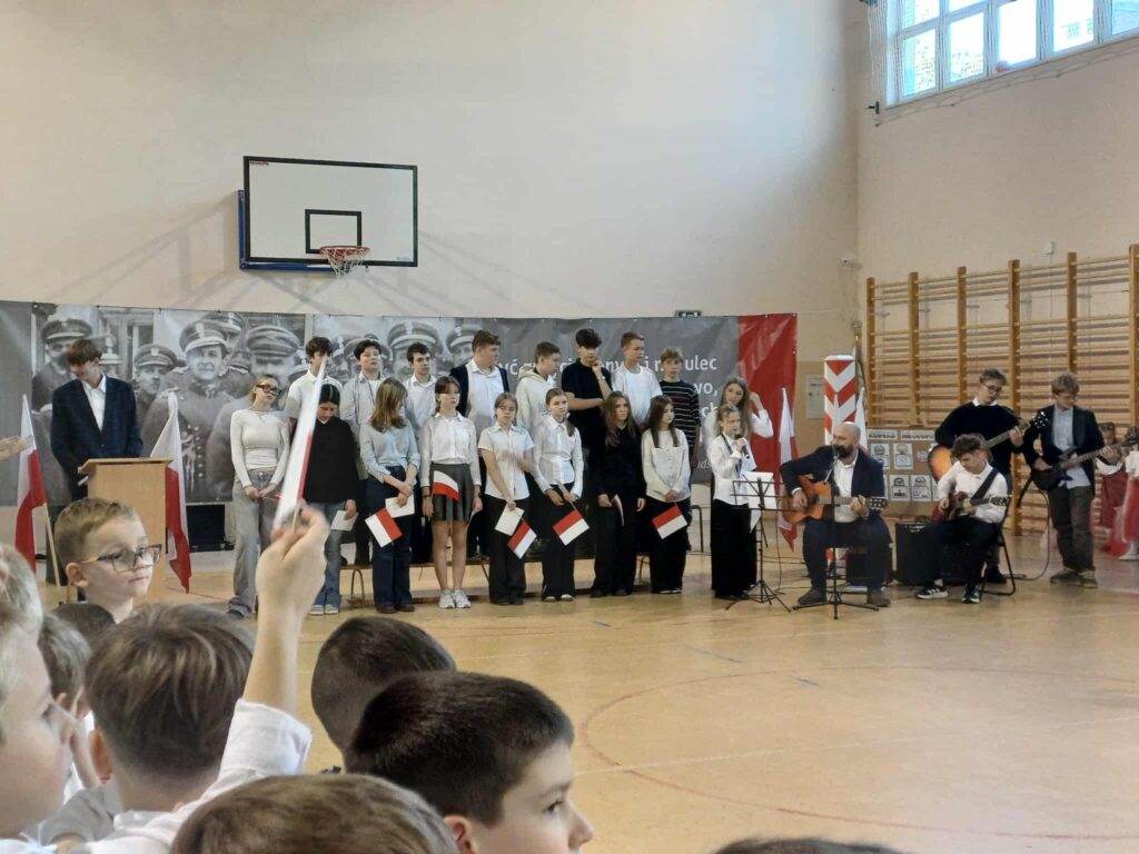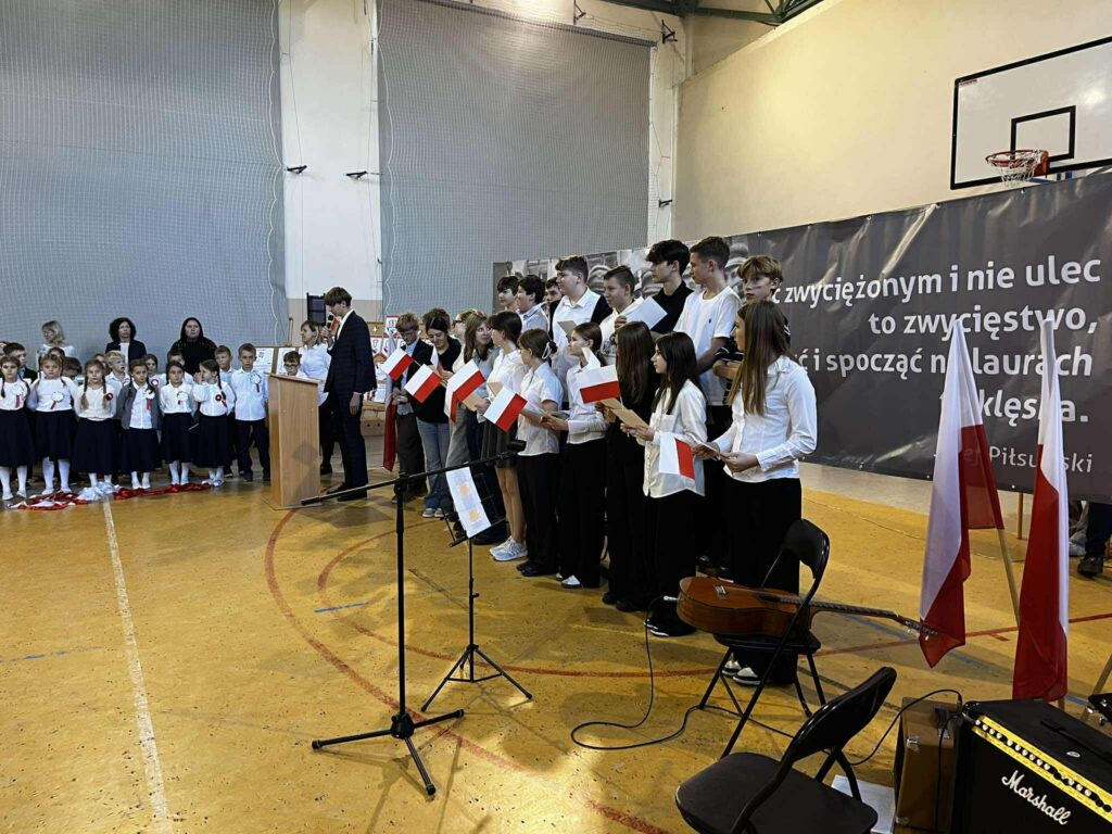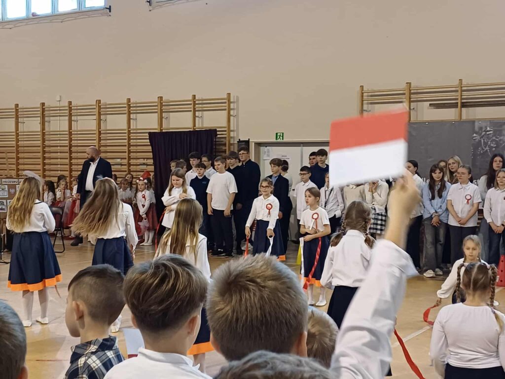 Uroczystość rozpoczęła się w podniosłym tonie — wejście pocztu sztandarowego i wspólne odśpiewanie „Mazurka Dąbrowskiego” podkreśliły rangę wydarzenia. Na scenie zaprezentowali się uczniowie klas 1, 3, 2 i 8, zabierając publiczność w podróż przez historię, refleksję i radość wspólnego świętowania.
