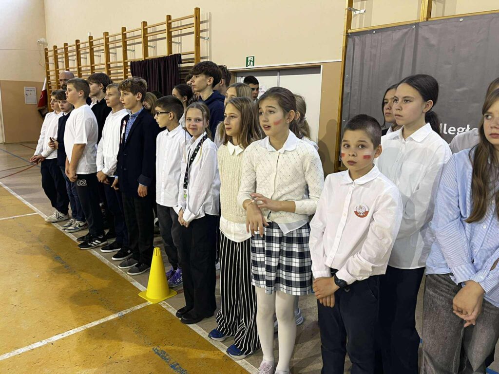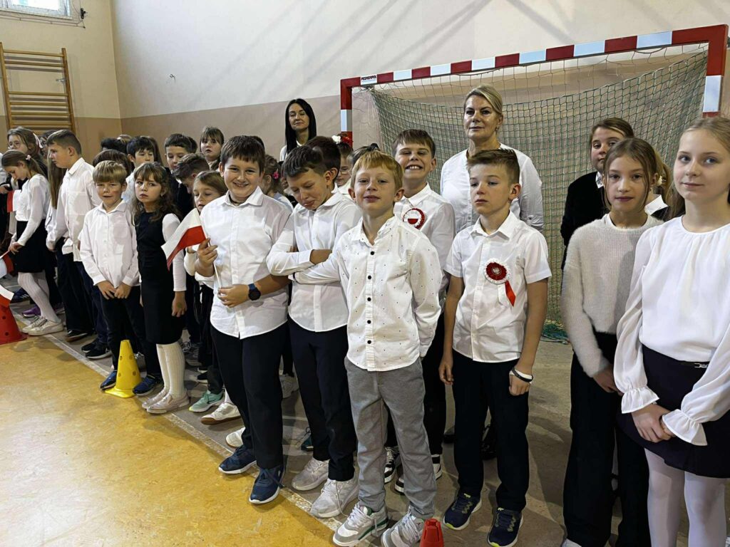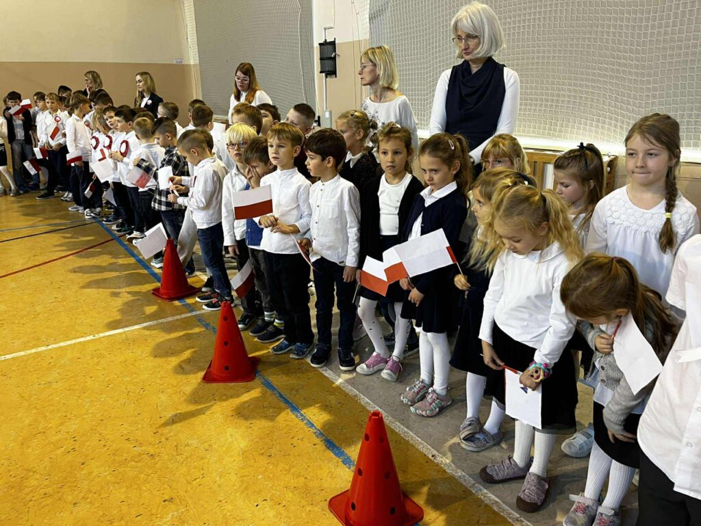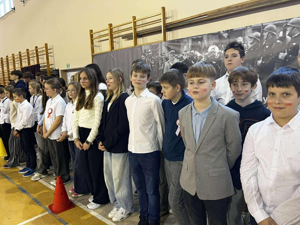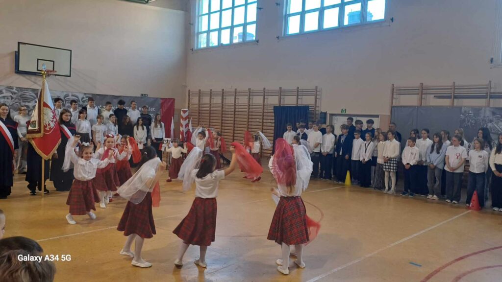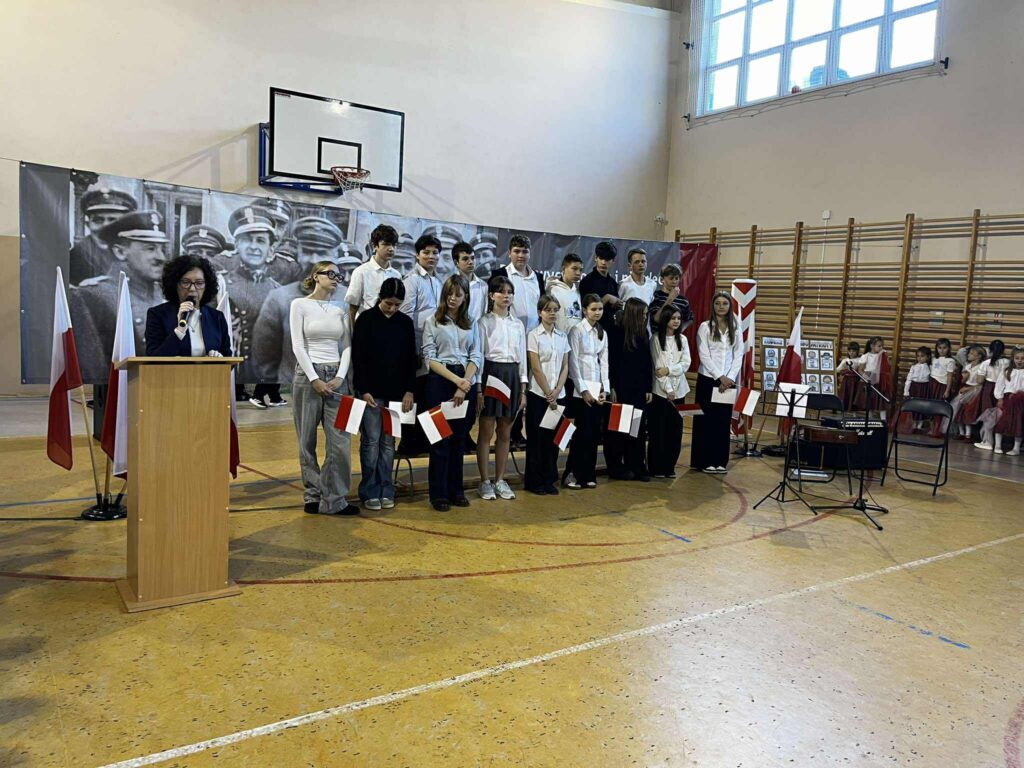 Uroczystość rozpoczęła się w podniosłym tonie — wejście pocztu sztandarowego i wspólne odśpiewanie „Mazurka Dąbrowskiego” podkreśliły rangę wydarzenia. Na scenie zaprezentowali się uczniowie klas 1, 3, 2 i 8, zabierając publiczność w podróż przez historię, refleksję i radość wspólnego świętowania.