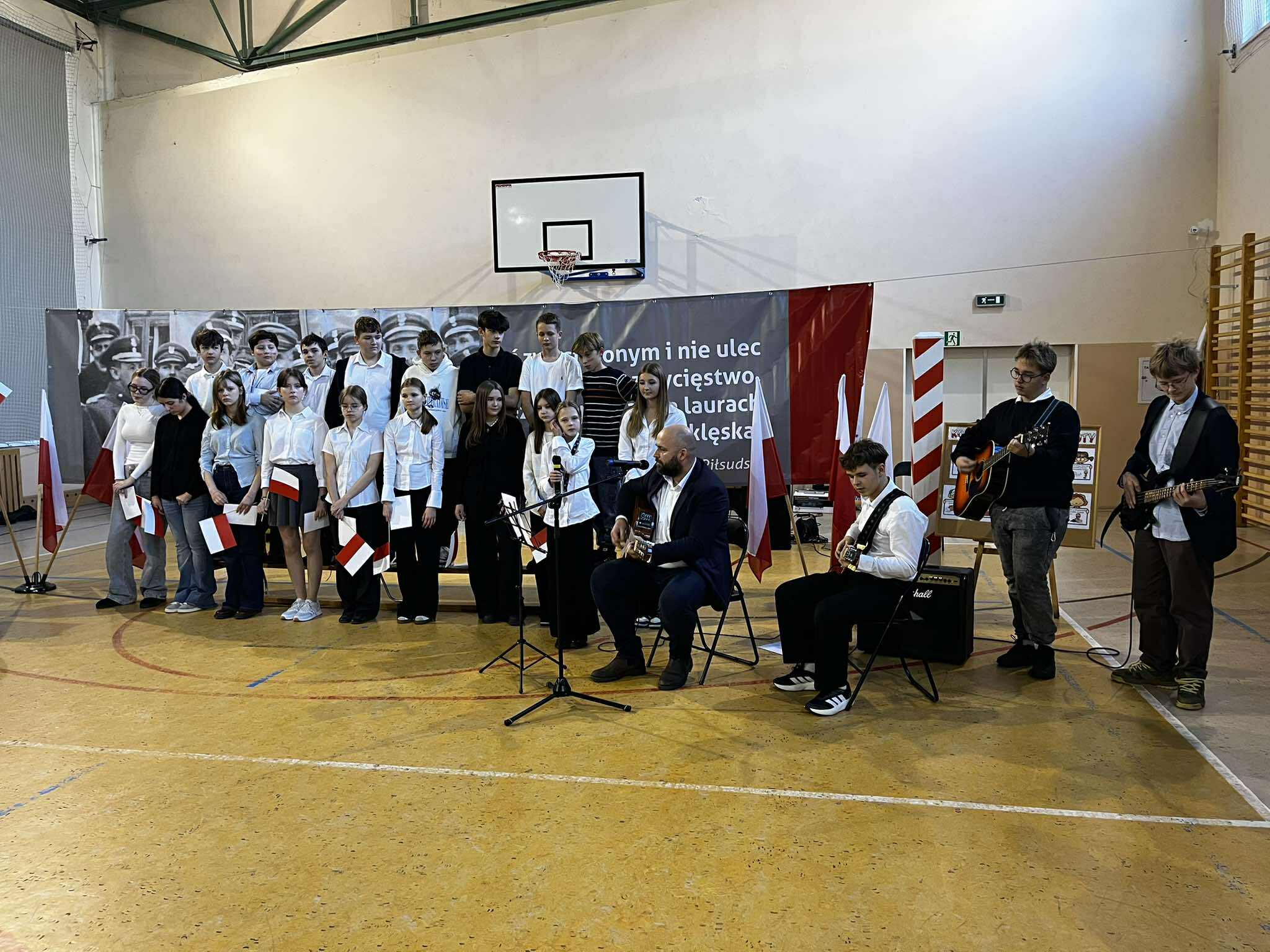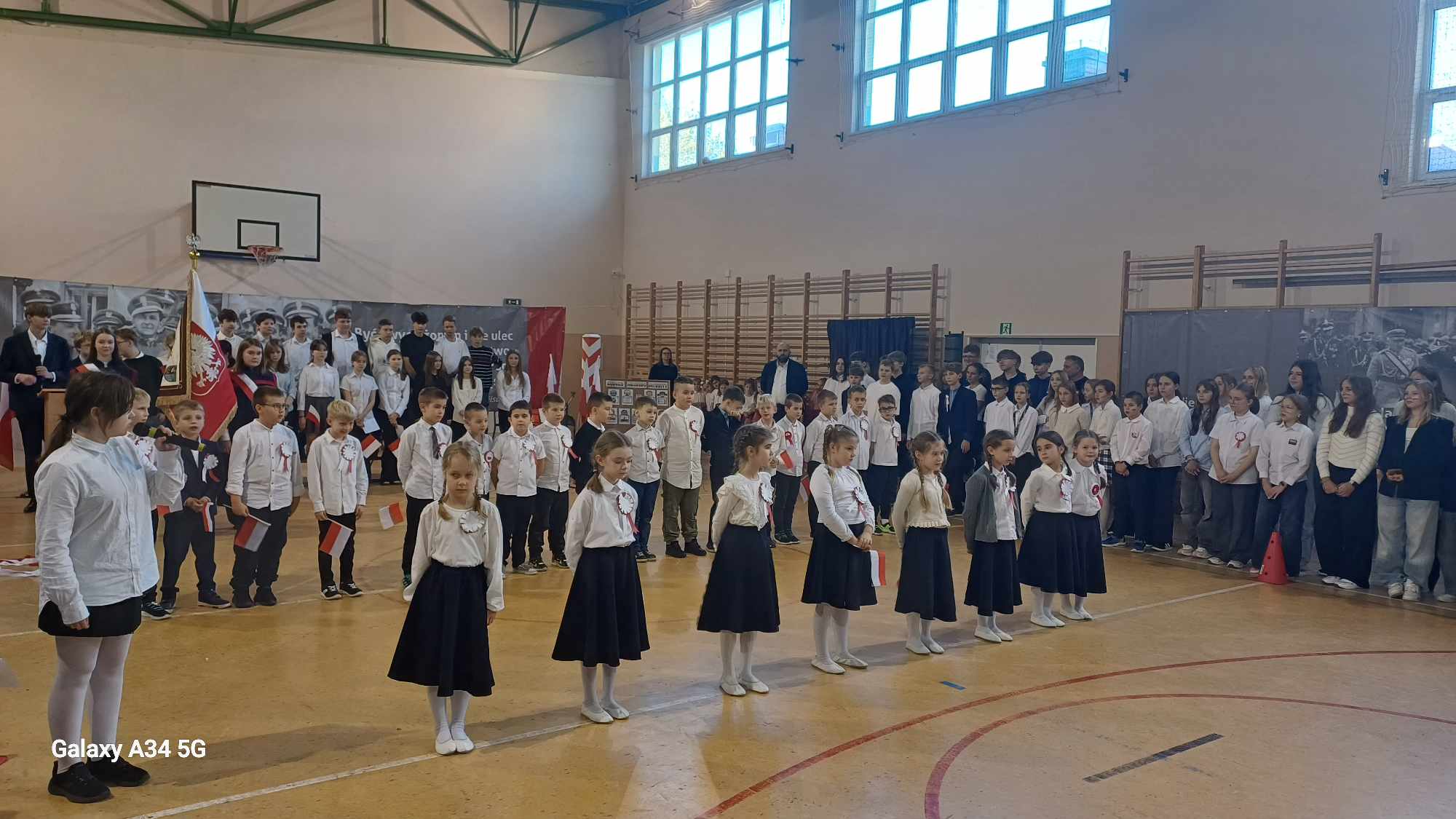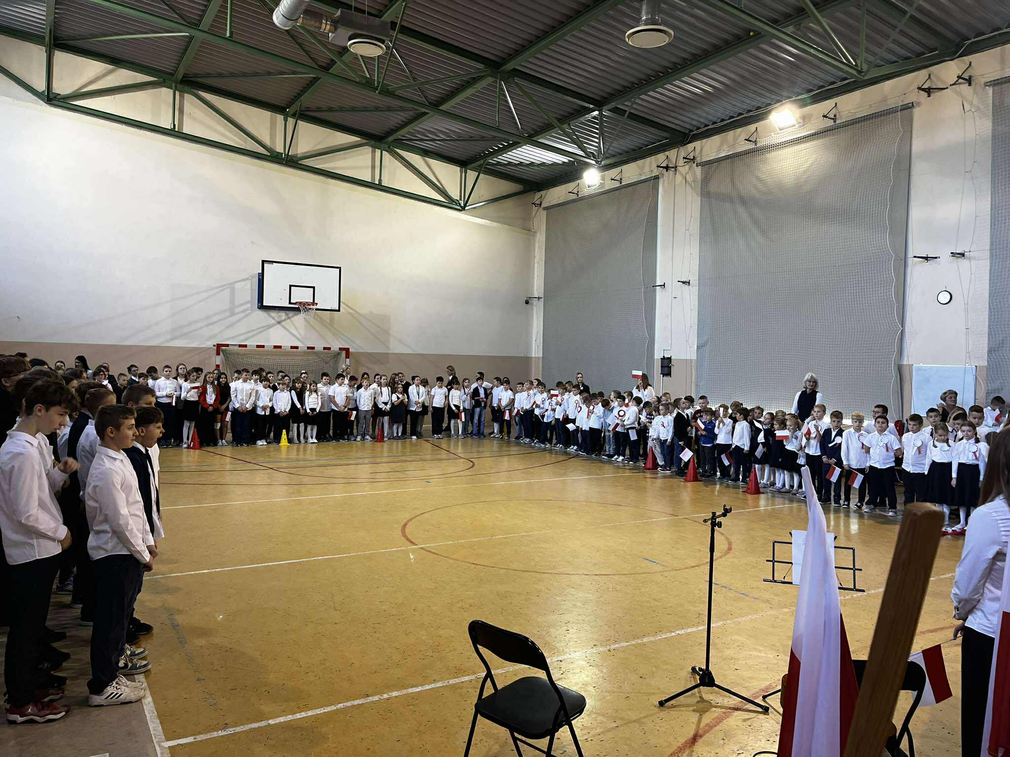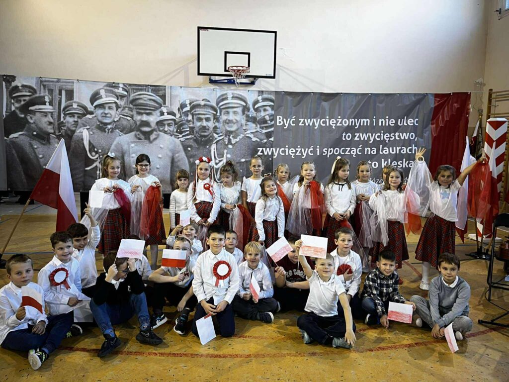 Uroczystość rozpoczęła się w podniosłym tonie — wejście pocztu sztandarowego i wspólne odśpiewanie „Mazurka Dąbrowskiego” podkreśliły rangę wydarzenia. Na scenie zaprezentowali się uczniowie klas 1, 3, 2 i 8, zabierając publiczność w podróż przez historię, refleksję i radość wspólnego świętowania.